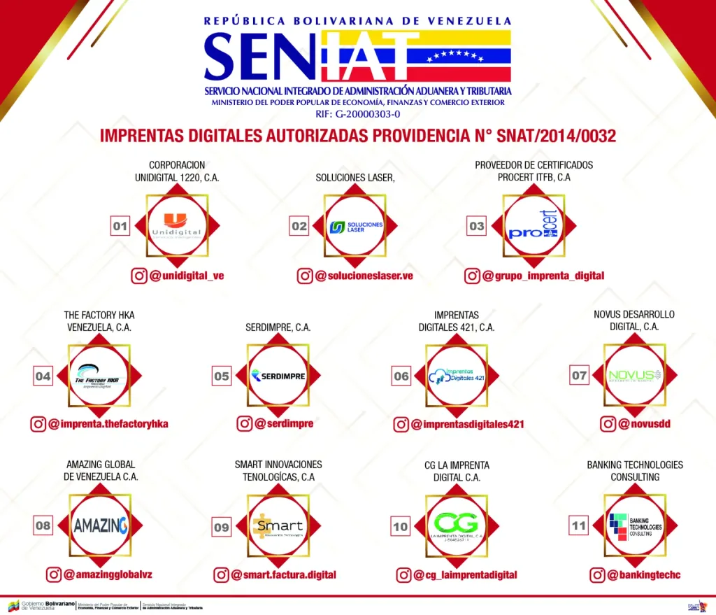 En el portal web del Seniat se encuentra un listado de 11 imprentas digitales autorizadas para la emisión de facturas digitales: