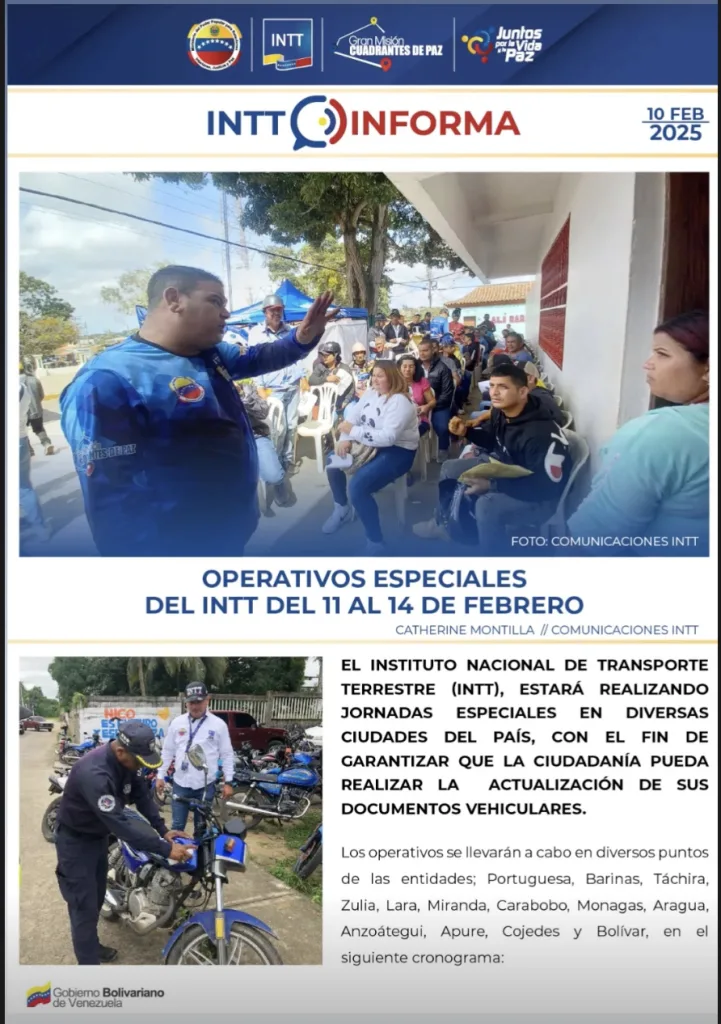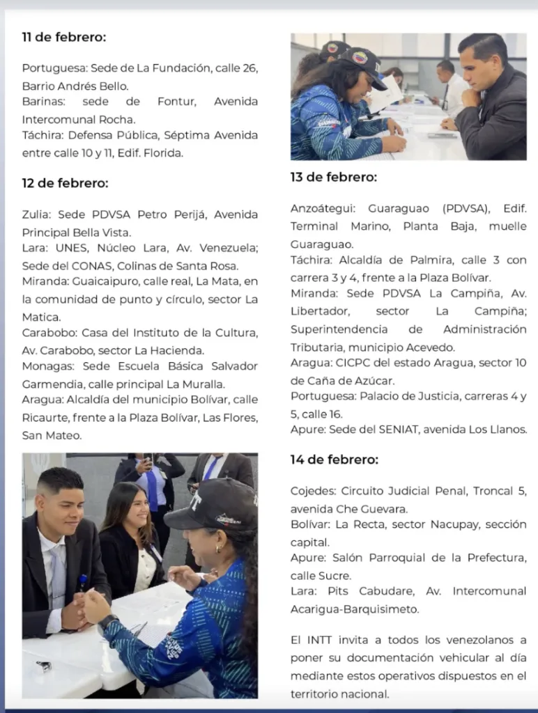 La jornada estará activa hasta el viernes 14 de febrero. El INTT publicó las direcciones donde estarán presentes hasta el último día del operativo. Esta es la lista