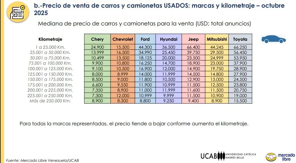 Según un estudio de la UCAB y Mercado Libre Venezuela, los vehículos más baratos que se venden en el país son de la marca Chery y el más caro —y buscado— es Toyota