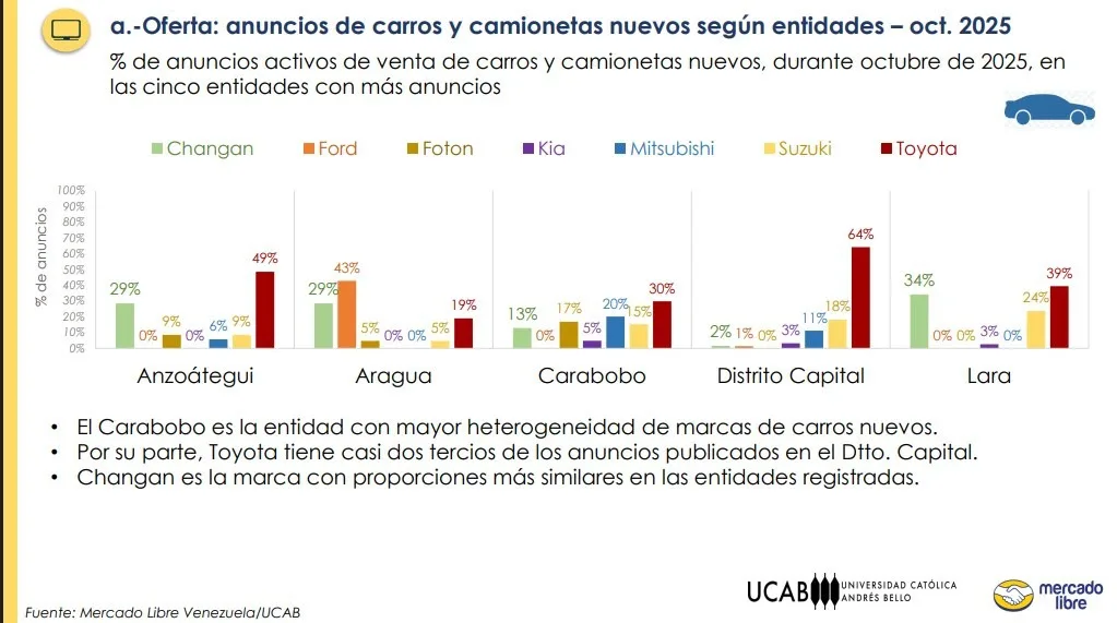 Este informe analizó 11.360 anuncios publicados en la plataforma de Mercado Libre durante octubre de 2025 y los resultados son claros: Distrito Capital es el estado principal para la venta de autos y camionetas. Siete de cada diez vehículos se ofertan en Caracas.