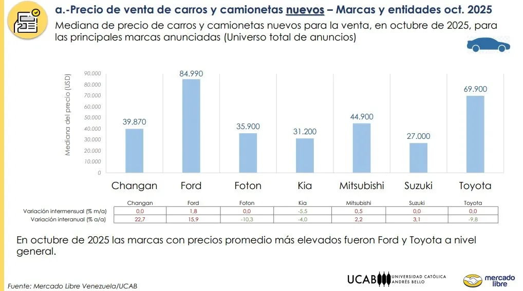 Mercado Libre indicó que, en promedio, el precio de los vehículos nuevos (carros y camionetas) varía entre los 27 mil y los 44.900 dólares. Las marcas más caras son Ford y Toyota, siendo la japonesa la que concentra casi dos tercios de las publicaciones con 64%.