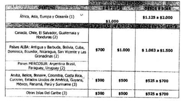 Los cupos para los viajes entre 8 y 15 días quedan disgregados de la siguiente forma: La agrupación geográfica 1, incluye África, Asia, Europa y Oceanía. Solo pueden optar a un máximo de $2.000 si el viaje es igual o superior a 15 días. La agrupación geográfica 2, que incluye Canadá, Chile, El Salvador, Guatemala, Honduras; los países del Alba (Antigua y Barbuda, Bolivia, Cuba, Dominica, Ecuador, Nicaragua, San Vicente y las Granadinas); los del Mercosur (Argentina, Brasil, Paraguay y Uruguay). Solo pueden optar a un máximo de $1.500 dólares para viajes iguales o superiores a 15 días. La agrupación geográfica 3, incluye los países con menor asignación: Aruba, Belice, Bonaire, Colombia, Costa Rica, Curazao, Estados Unidos, Guyana, México, Panamá, Perú y Suriname. Solo pueden optar por un máximo de $700 si el viaje dura 15 días o más.