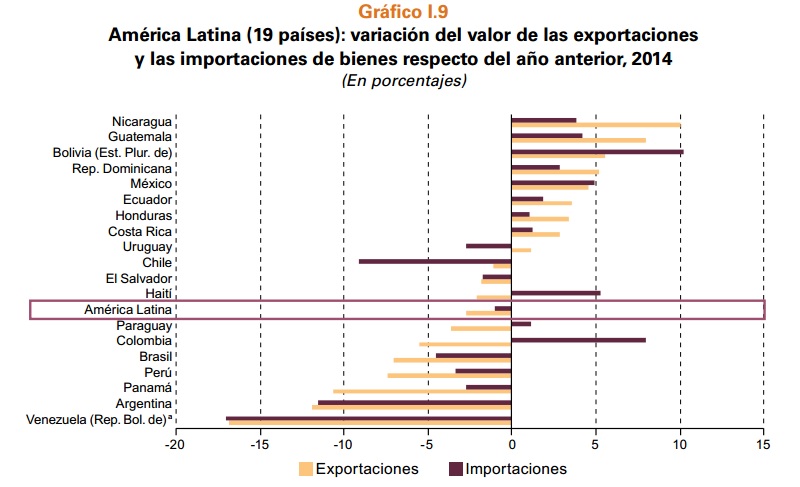 El valor de las importaciones y las exportaciones de América Latina mostraron caídas de 2,7% y 1%, respectivamente, en 2014. Venezuela fue el país con peores resultados en términos de intercambio comercial. Tanto las importaciones como las exportaciones mostraron una reducción de más de 15% en su valor entre 2013 y 2014.