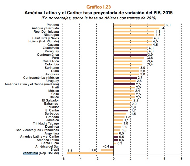 En cuanto al comportamiento del producto interno bruto, Brasil y Venezuela son los únicos dos países que sufrirán una contracción económica en 2015, según la Cepal. Venezuela registra una caída 5,5%.