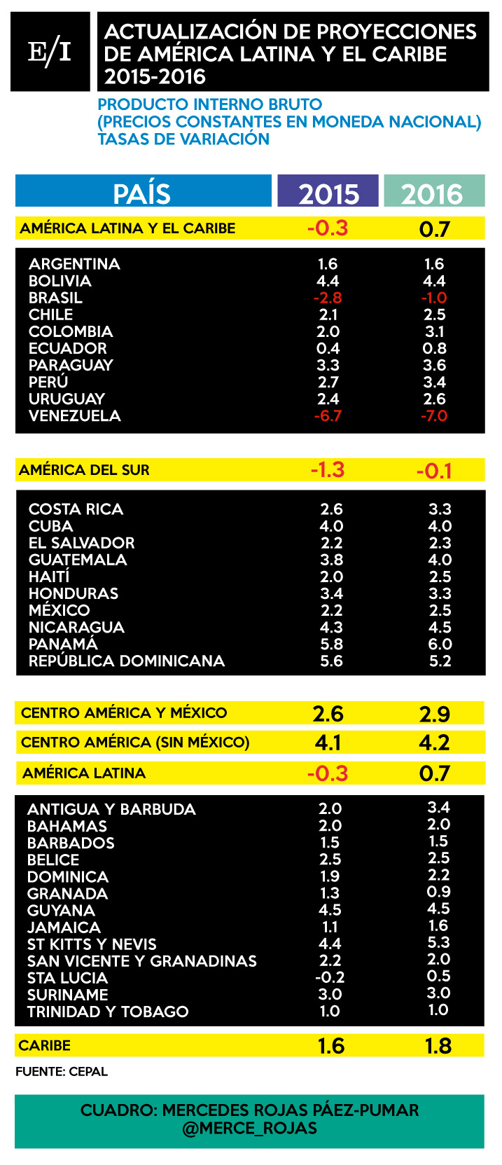 En 2012 esa posición aún la mantenía, pero en 2015 Venezuela queda desplazada de lejos al séptimo lugar y definitivamente es superada por Chile e incluso por Perú, países que junto a Brasil, México, Argentina y Colombia, se convierten en las principales economías de la región.