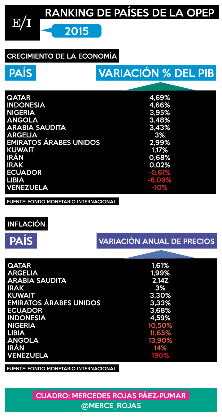 Cuando la comparación del PIB por habitante se hace entre los miembros de la OPEP, Venezuela tradicionalmente había figurado en el sexto lugar, superada por Qatar, Emiratos Árabes Unidos, Kuwait, Arabia Saudita y Libia, pero en el listado de 2015 indica un descenso al décimo puesto por debajo de Ecuador, Irán, Irak y Argelia.