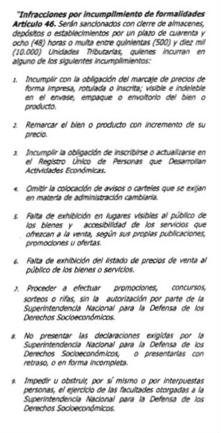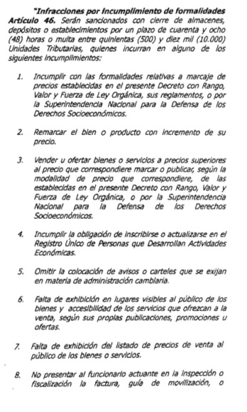 A través de un aviso publicado en Gaceta Oficial número 40.787, la Vicepresidencia de la República reformó el artículo 46 de la Ley Orgánica de Precios Justos para añadir nuevos motivos de sanción.