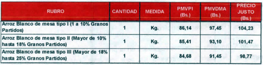 Si los montos determinados por la Sundde se mantienen después de la revisión, el arroz blanco tipo I habría sufrido un impacto de 316%, al pasar de Bs 25 a Bs 104 el kilo. El tipo II, aumentaría 337%, al pasar de Bs 23,23 a 101,47; mientras que el tipo II subiría 349%, al pasar de Bs 22 a Bs 98,77.