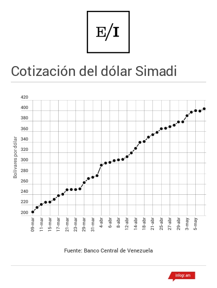 ¿Hasta dónde dejará subir el gobierno la tasa Simadi? Se desconoce. Pero en apenas dos meses, desde que se dio a conocer el Convenio Cambiario N°35, el tipo de cambio ha ganado 196,67 bolívares, en tanto se mantuvo estancado en los 199 bolívares la mayor parte de su primer año de vida, cumplido en febrero de 2016.