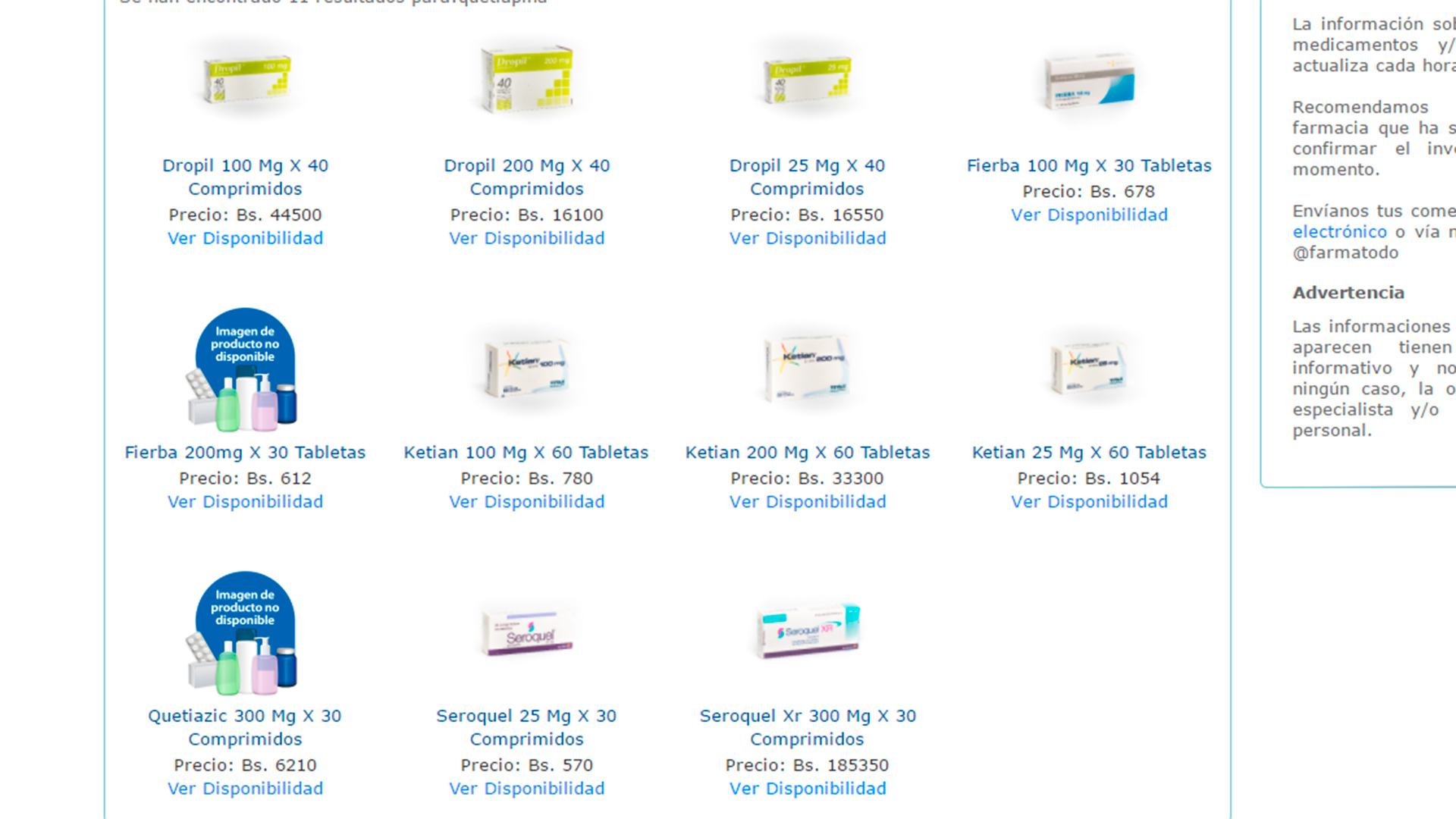 La quetiapina de 300 miligramos para pacientes psiquiátricos está disponible en Farmatodo de Vista Alegre. A simple vista es una buena noticia para quienes tienes meses peregrinando por farmacias en busca de uno de los medicamentos más escasos. Lo negativo: una caja de 30 comprimidos cuesta 185.000 bolívares, casi tres salarios mínimos.
