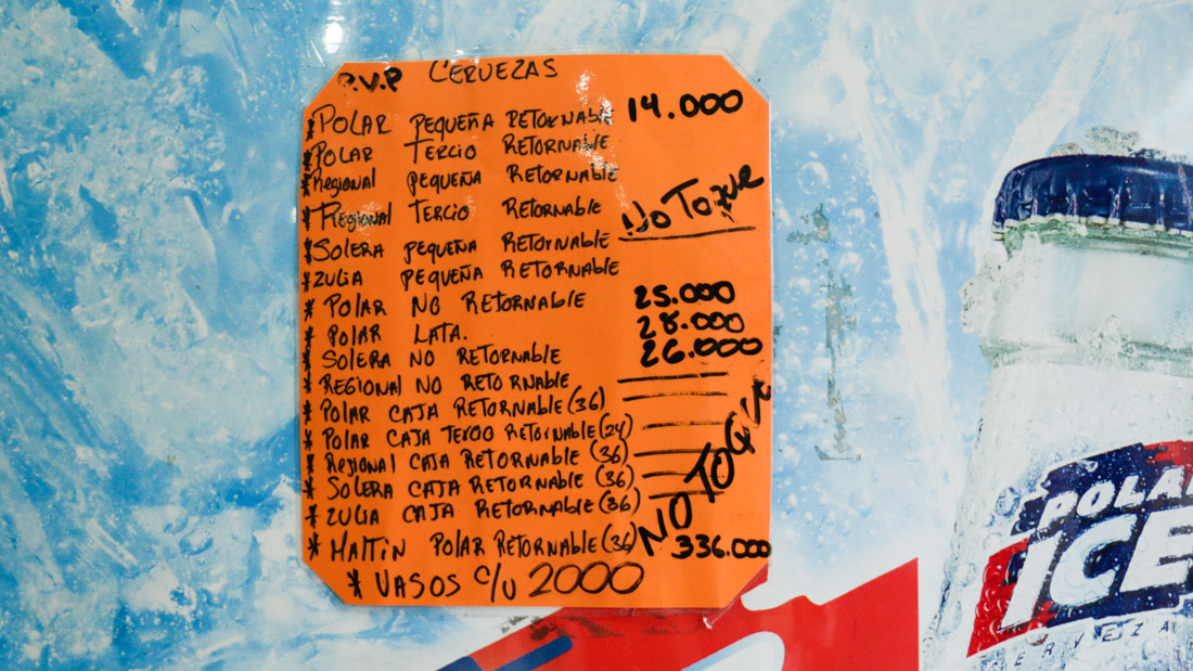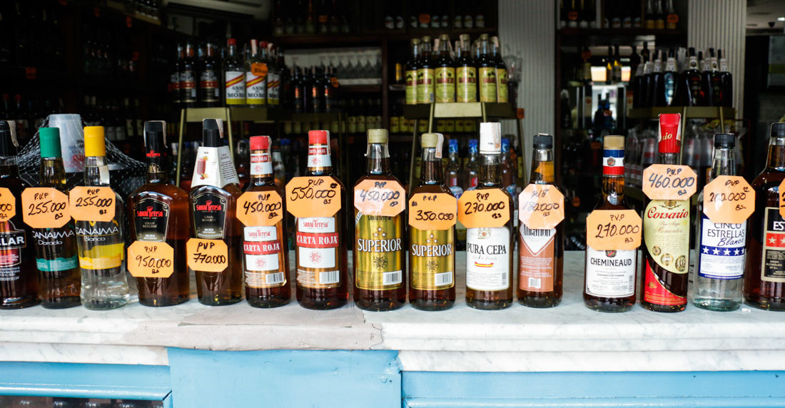 Entre las bebidas «más baratas» que ofrece el bodegón está el aguardiente 0 caña clara, cuyos precios oscilan entre Bs 150.000 y Bs 200.000 y licores a base de ron, con precios entre Bs 180.000 y Bs 200.000.