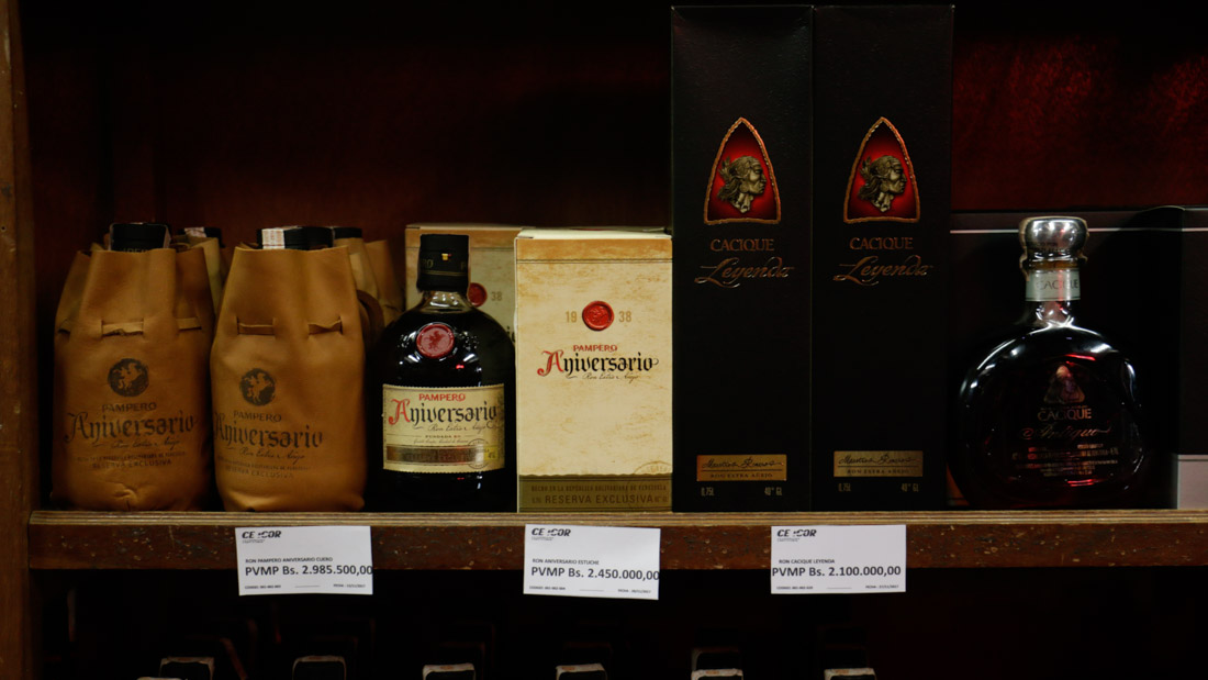 En la tienda Celicor de La Castellana, la bebida «más popular», según el encargado, es la cerveza que se vende al público por Bs 19.500 por unidad. En sus vitrinas exhiben uno de los rones de Santa Teresa en Bs 594.000, pero el ron Bicentenario mostraba un precio de Bs 15 millones.