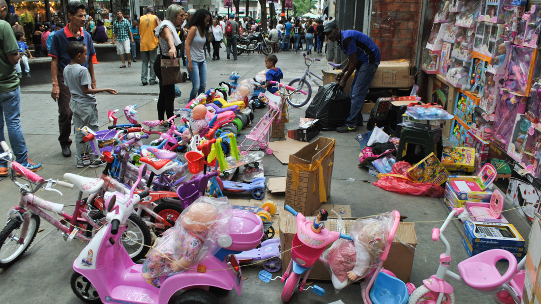 Yelitza tiene 18 años vendiendo juguetes en una pared del bulevar de La Hoyada. Entre cinco miembros de su familia se reparten la jornada laboral. Bicicletas, carritos, bebés de plástico y muñecas es lo tiene para ofrecer; muchos preguntan, pocos compran. Solo trabaja con punto de venta –prestado–, cero efectivo.