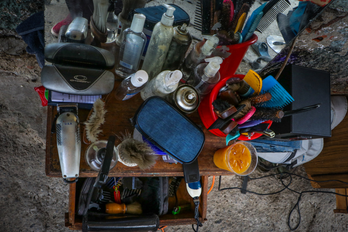 La improvisada tienda tiene un espejo y otros instrumentos para la «cortadera de cabello callejera». Cepillos, tijeras y máquinas con sus aliados. Cortarse el cabello con José cuesta un dólar, recibe pago móvil, efectivo y si le pagan con dólar para él es mejor.