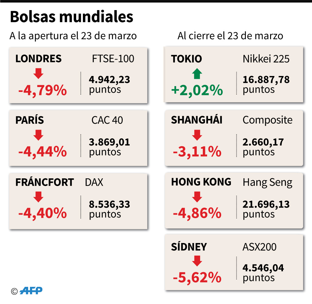 Las bolsas se vieron afectadas por el fracaso el domingo del Congreso estadounidenses para aprobar un plan para movilizar unos dos billones de dólares para apoyar a la economía frente a la pandemia de coronavirus.