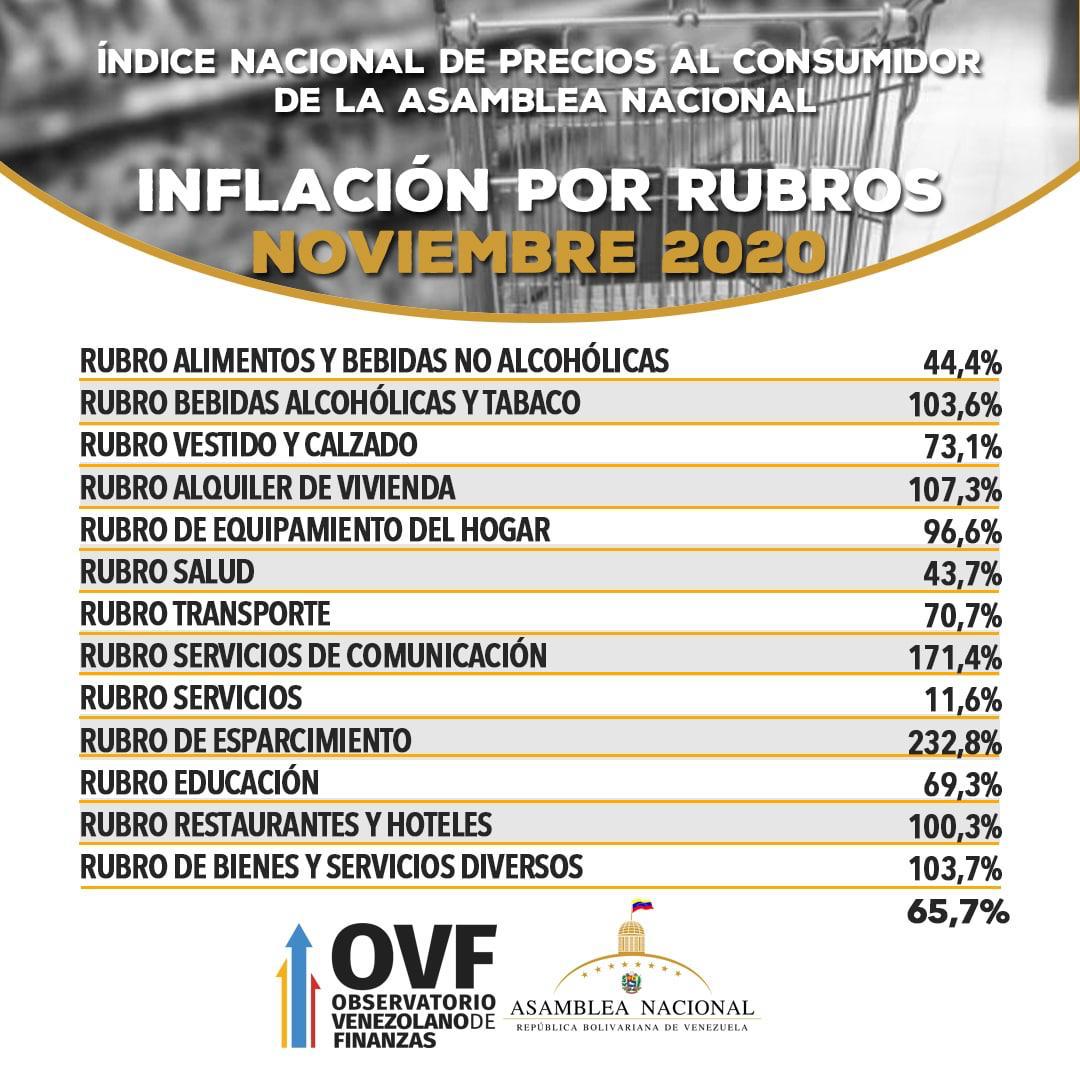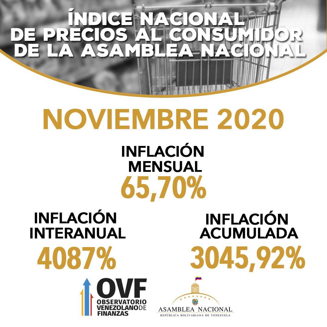 El reporte mensual de la Asamblea Nacional da muestra de lo que muchos venezolanos sintieron en noviembre y que siguen sintiendo en el mes de diciembre: la hiperinflación se aceleró. Durante noviembre de 2020, el índice nacional de precios al consumidor cerró en 65,70%, lo cual representa un incremento de 41,9 puntos porcentuales respecto a la inflación de octubre (23,8%).