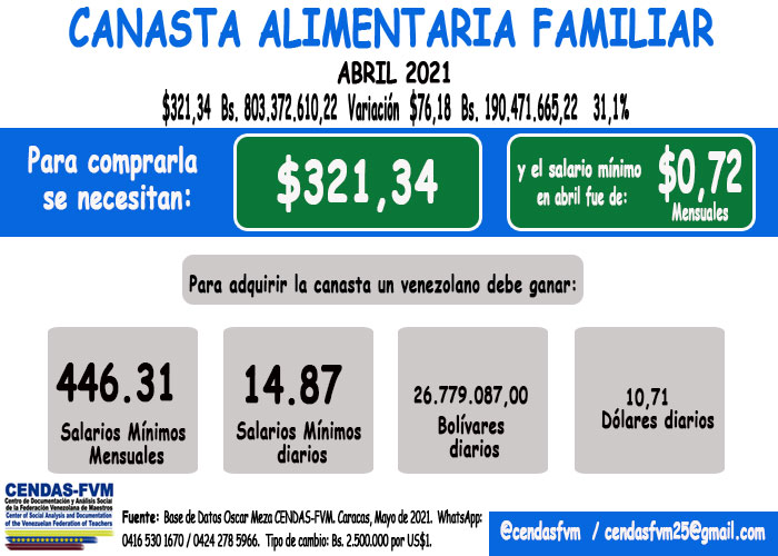 La variación de abril es de $76,18 o 190.471.665,22 bolívares, una cifra que pulveriza el salario mínimo de 7.000.000 de bolívares ($0,72) que estableció el gobierno de Maduro el 1 de mayo. De acuerdo con Cendas FVM, para cubrir la canasta alimentaria un venezolano requiere 446.31 salarios mínimos mensuales. Es decir, 14.87 salarios mínimos diarios para un total de Bs. 26.779.087,00 ($10,71).