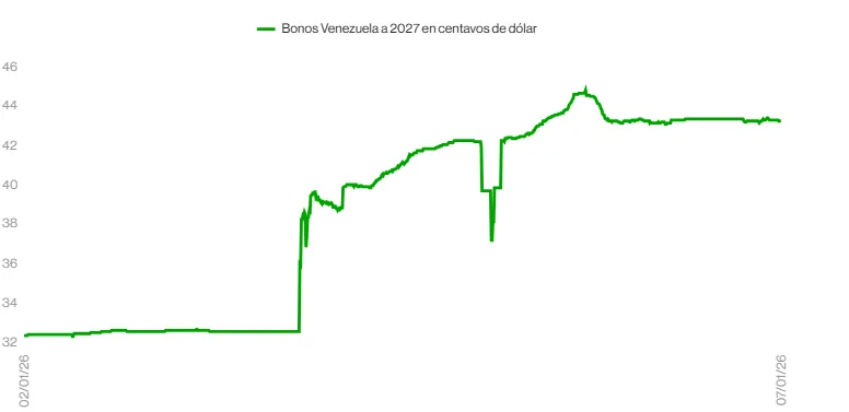 Entre el 4 y el 7 de enero, el bono soberano venezolano con vencimiento en 2027 subió de 32,92 centavos de dólar a 43,62 centavos, lo que representa un alza de 32,5 % en apenas tres jornadas. En el mismo período, el bono de PDVSA con vencimiento en 2026 avanzó de 23,41 a 32,56 centavos, acumulando una ganancia cercana al 39 %.