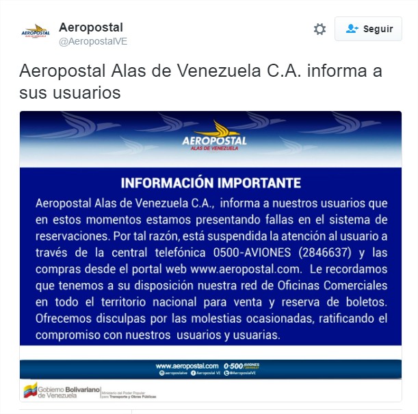 En un comunicado colgado en su cuenta de Twitter, la línea aérea del Estado Aeropostal informó desde el pasado lunes que el servicio telefónico 0-500 Aviones está suspendido temporalmente, así como la compra en linea a través de su página www.aeropostal.com.