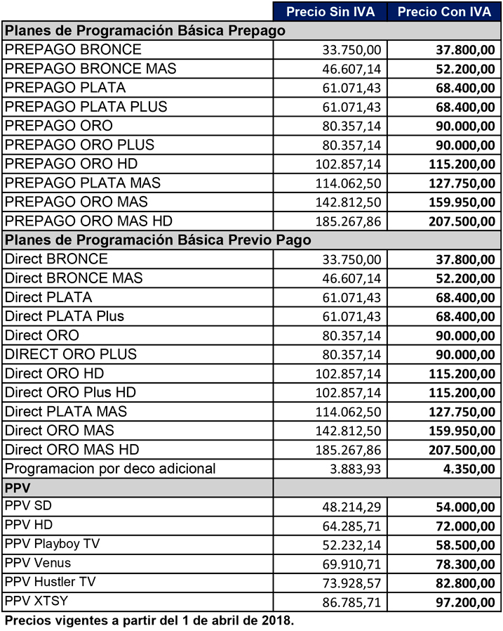 También sufrieron cambios los precios de la programación de pago por evento: una película en definición estándar se paga en Bs 54.000 y una en HD Bs 72.000.