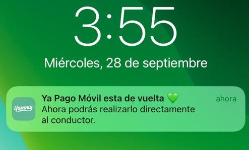 «Ya Pago Móvil está de vuelta. Ahora podrás realizarlo directamente al conductor», se lee en una notificación de Yummy.