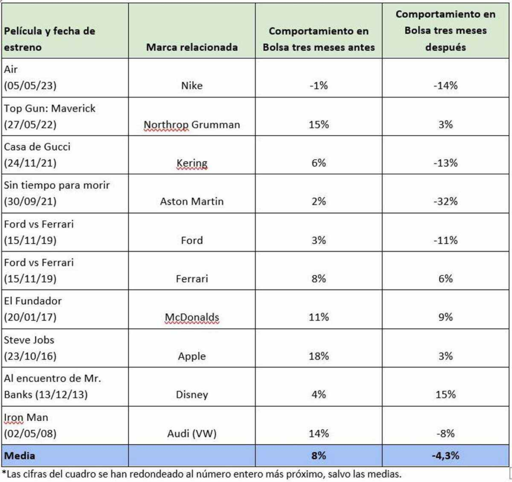 Un artículo publicado por ElEconomista.es muestra el panorama de las marcas tras estrenos taquillero. La conclusión es que aunque las películas centradas en una marca tienden a crear un impulso significativo en el precio de las acciones en los tres meses previos al estreno, el entusiasmo tiende a disminuir en los tres meses siguientes. Así lo ilustran varios ejemplos recientes en los que las películas se han centrado por completo en la historia de una marca o en los que éstas han recibido un destacado emplazamiento de producto en películas taquilleras.