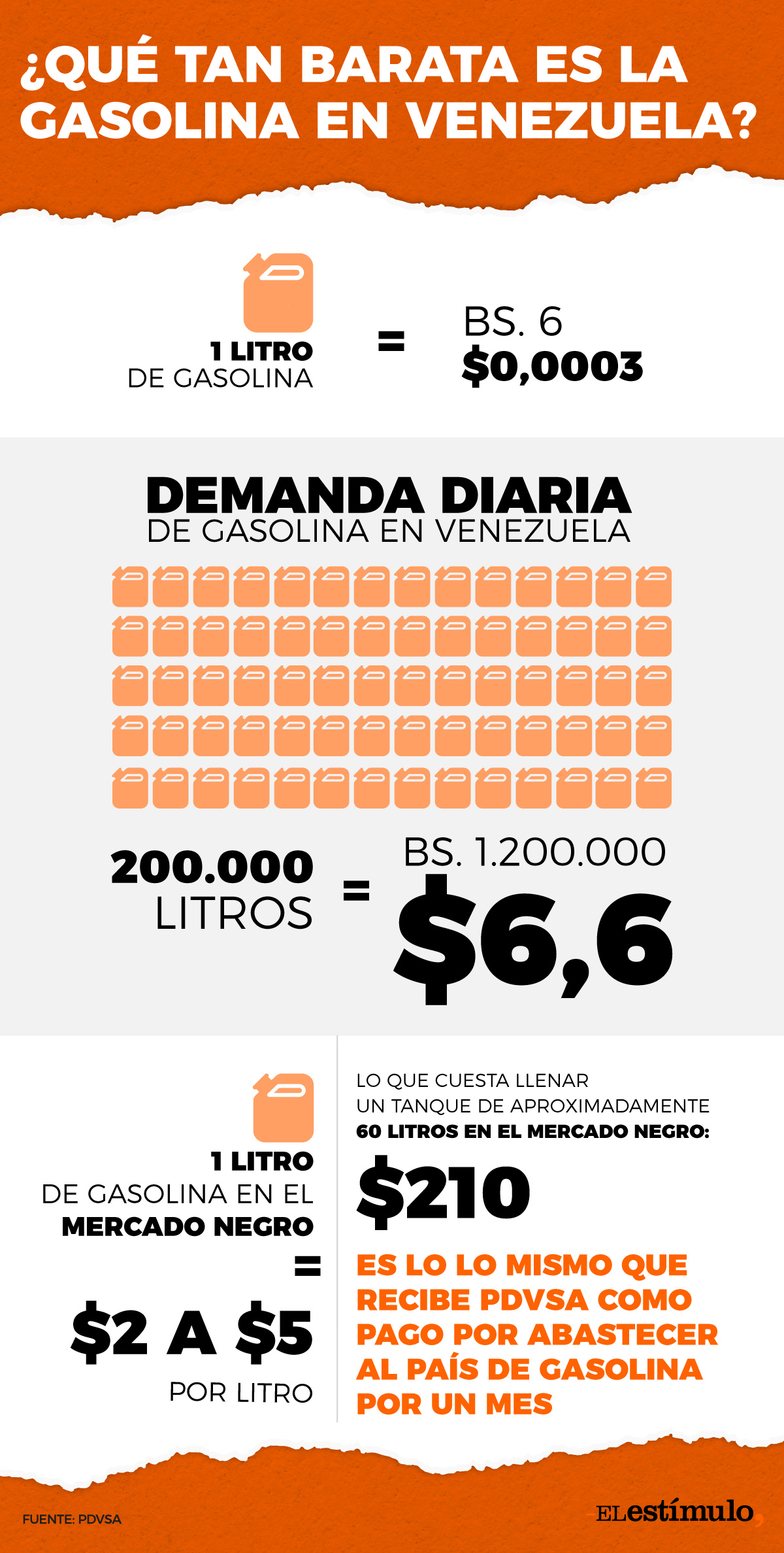 En Venezuela la gasolina ya ni siquiera se puede considerar subsidiada, sino que es regalada. Un litro de gasolina cuesta tan solo 6 bolívares, lo cual equivale a 0,0003 dólares. La demanda nacional de combustible se ubica en torno a los 200.000 litros al día, por lo que el país entero paga diariamente $6,6 dólares al día por toda la gasolina que se vende.