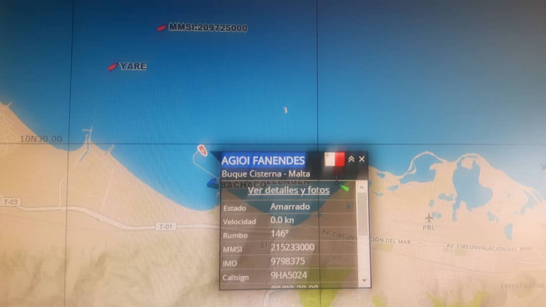 El primer buque que desde El Estímulo detectamos fue el tanquero Agioi Fanendes. Este barco petrolero llegó a Venezuela cerca de las 2 am del miércoles 16 de septiembre y se ancló en la Refinería El Palito.