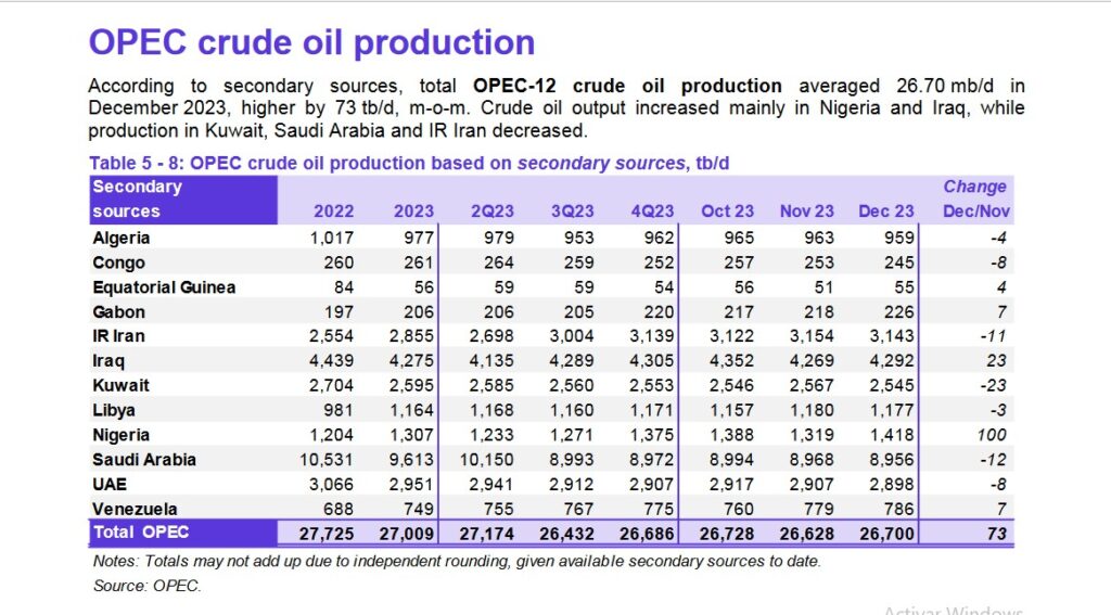 En el cuarto trimestre la producción media de crudo OPEP fue de 26,7 millones de bpd, es decir, 1,9 millones de bpd menos que la demanda de crudo OPEP. Para todo el año 2023, la producción de crudo del grupo fue de 27,0 millones de bpd, es decir, 600 mil bpd menos que la demanda.