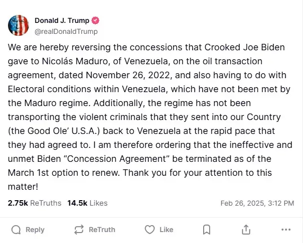 Finalmente la Oficina de Control de Activos Extranjeros (Ofac) oficializó lo que Trump ya había dicho en una publicación en su cuenta de Truth Social, el fin de la flexibilización de sanciones que su predecesor Joe Biden había concedido al Gobierno de Maduro en noviembre de 2022 y que permitían una mayor operación de Chevron en territorio venezolano. El cierre de las operaciones bajo esta licencia tiene como fecha el 3 de abril, lo que le da solo un mes a la empresa petrolera Chevron para paralizar gran parte de sus operaciones.
