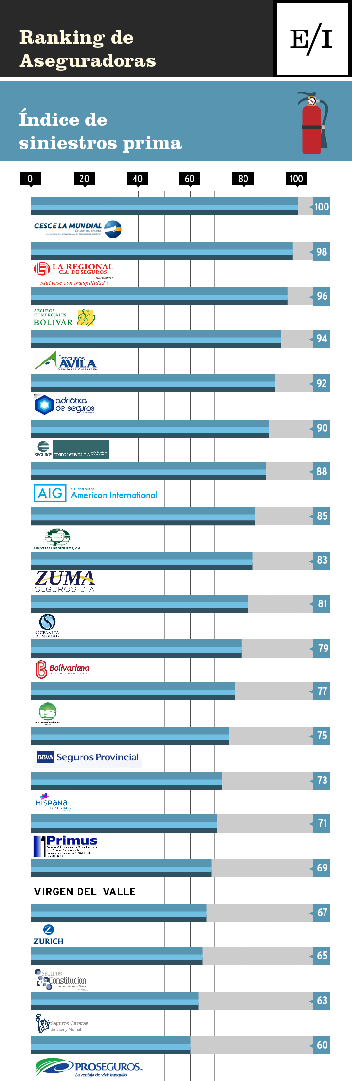 El ranking de compañías de seguros correspondiente al mes de abril muestra la posición de las empresas según cada índice. En función de este se le otorga una puntuación que resulta de multiplicar por 100 la posición relativa y el resultado se divide entre la cantidad de instituciones del sistema (48).