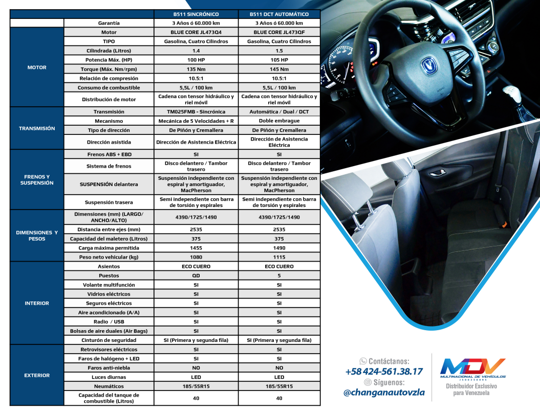 Este automóvil de Changan Auto viene en dos versiones: manual y automática. Es un modelo tipo sedán que cuenta con 3 años de garantía, motor de 4 cilindros y una potencia de 100 caballos de fuerza.