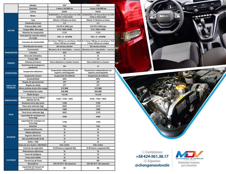 Entre sus características más destacables están su dirección hidráulica, su motor a diesel de 4 cilindros, doble cabina y su garantía de 3 años o 60 mil kilómetros.