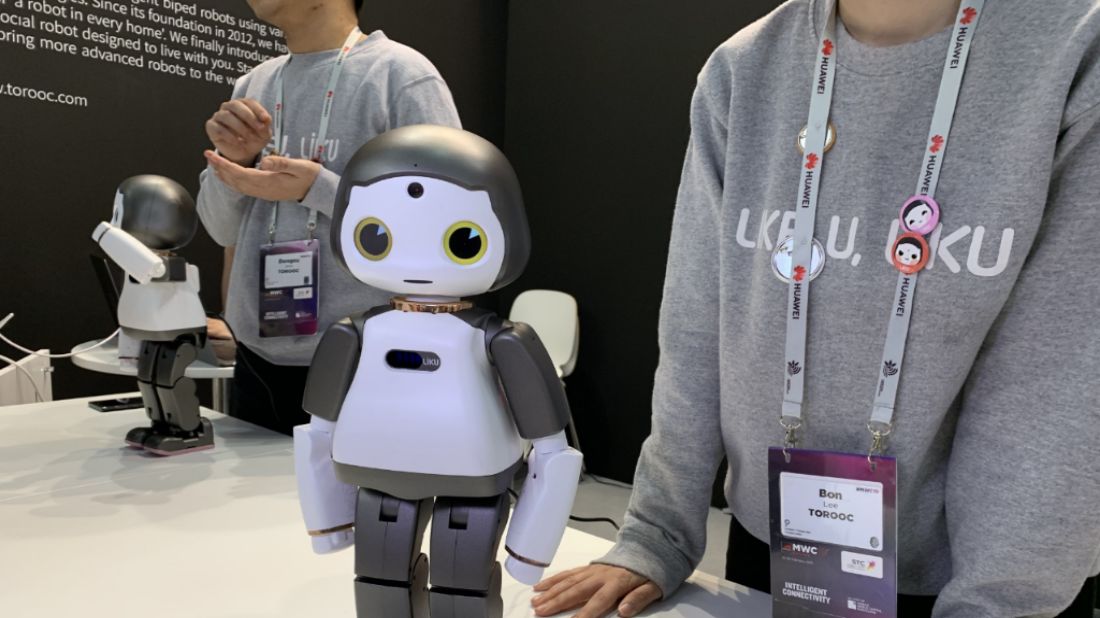 La empresa surcoreana Torooc concentró las miradas con su pequeño robot de compañía llamado Liku, que camina y expresa emociones como un humano con sus grandes ojos.