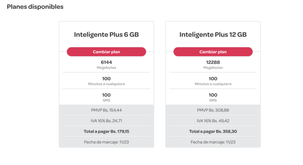 Por otra parte, el plan Inteligente Plus de 500 mb ahora tiene un valor de Bs. 28,91 o US$ 0,82. Este servicio ofrece 500 minutos a cualquier operadora y 500 mensajes de texto.