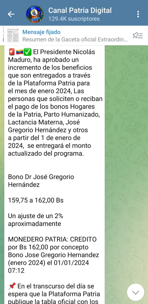 «Monedero Patria: Crédito por Bs. 162 por concepto de bono José Gregorio Hernández (enero de 2024)», destacó el mensaje que recibieron los beneficiarios.