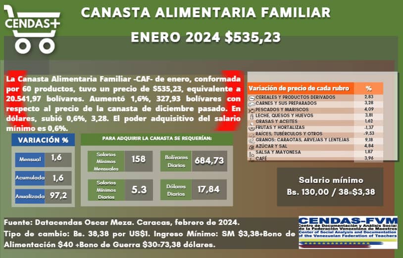 El director del Centro de Documentación y Análisis Social de la Federación Venezolana de Maestros (Cendas-FVM), Óscar Meza, informó que la Canasta Alimentaria Familiar del mes de enero de 2024, se ubicó en US$ 535,23, el equivalente a Bs. 20.541,97, por lo que comer en Venezuela aún sigue siendo un reto para la gran mayoría.
