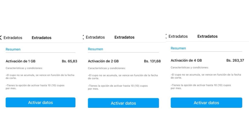 Movistar también tiene un servicio de extradatos, que sirve para cuando el usuario todos los GB de su plan mensual. Estos cupos no recibieron ajuste con respecto al mes de abril: