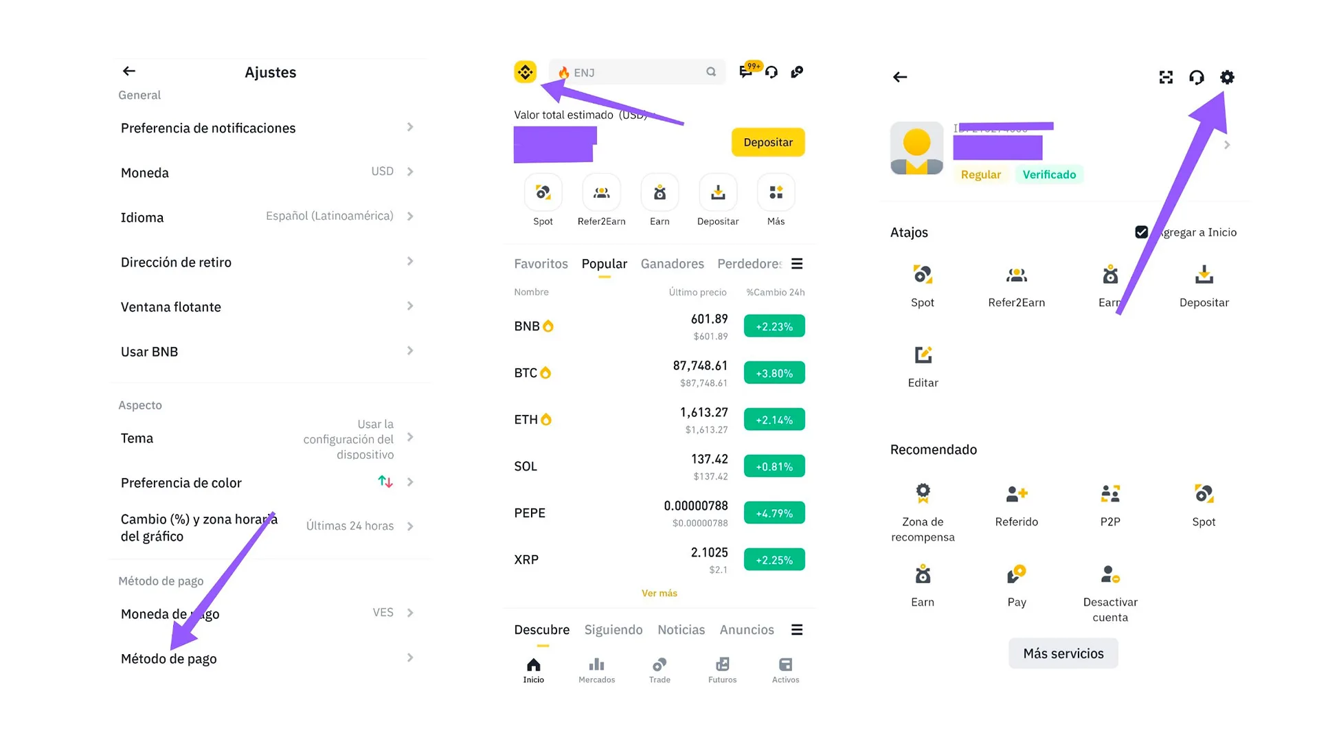 1. Abre tu cuenta de Binance, ve a la configuración, entra en “Método de pago”, luego “Método(s) de pago en P2P” y agrega Zinli simplemente añadiendo tu correo electrónico.