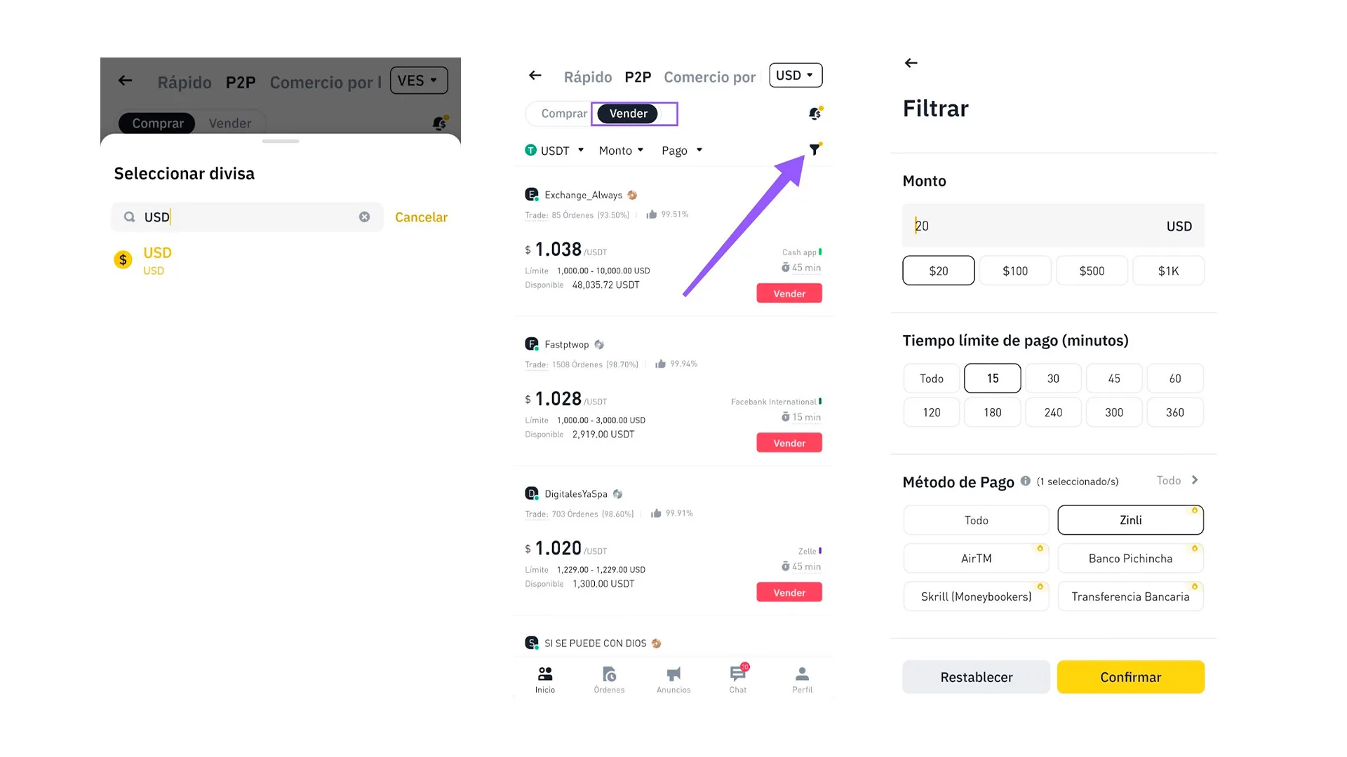 4. Ahora, configura los detalles de la operación, cambiando de “Comprar” a “Vender” (para vender USDT y recibir como pago el saldo en Zinli) e ingresando en el filtro para seleccionar Zinli como método de pago y establecer otros parámetros como monto y tiempo estimados.
