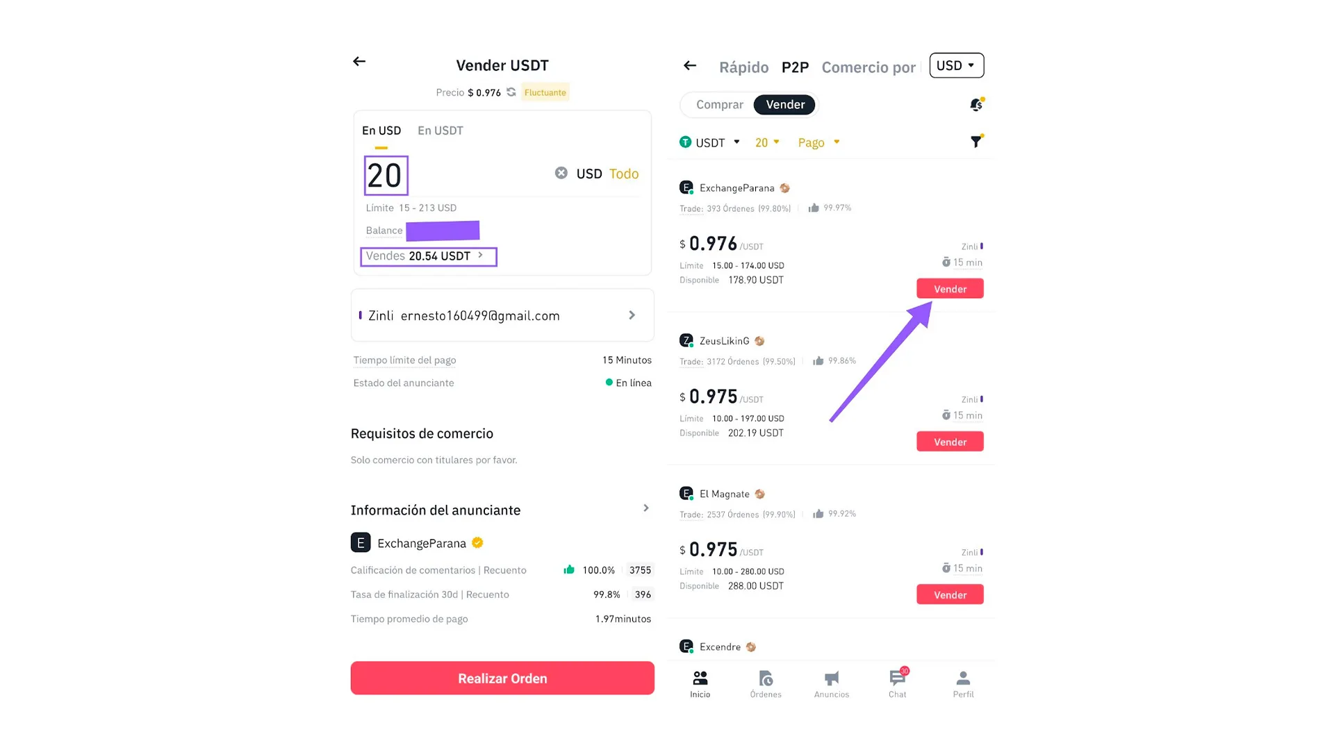 6. Puedes especificar cuántos USD quieres recibir en Zinli o bien cuántos USDT quieres vender. Haz clic en “Realizar Orden” para iniciar la operación.