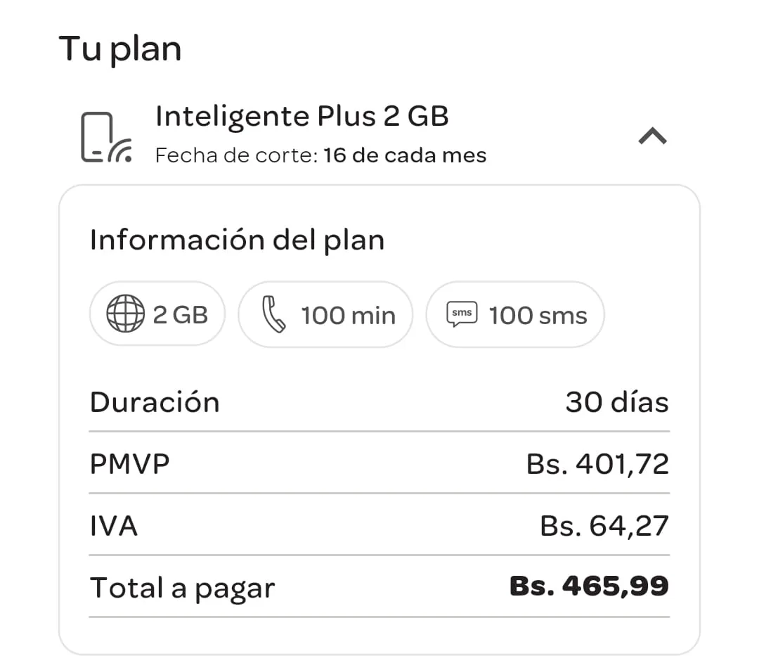• Plan Inteligente Plus 2 GB: Bs. 465,99 bolívares o 1,88 dólares.