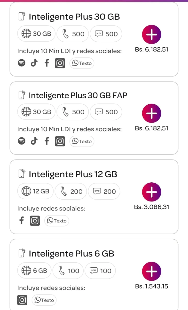 • Plan Inteligente Plus 30 GB: Bs. 6.182,51 o 24,99 dólares.