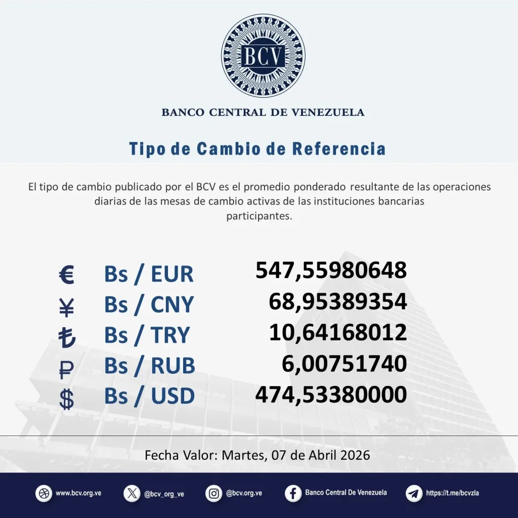 El precio del dólar BCV ya superó los 474 bolívares por dólar. El dólar oficial del Banco Central de Venezuela (BCV) se paga este martes 7 de abril en 474,53 bolívares por dólar. Mientras, el euro, la moneda que actualmente tiene mayor valor, se ubica en 547,55 bolívares.