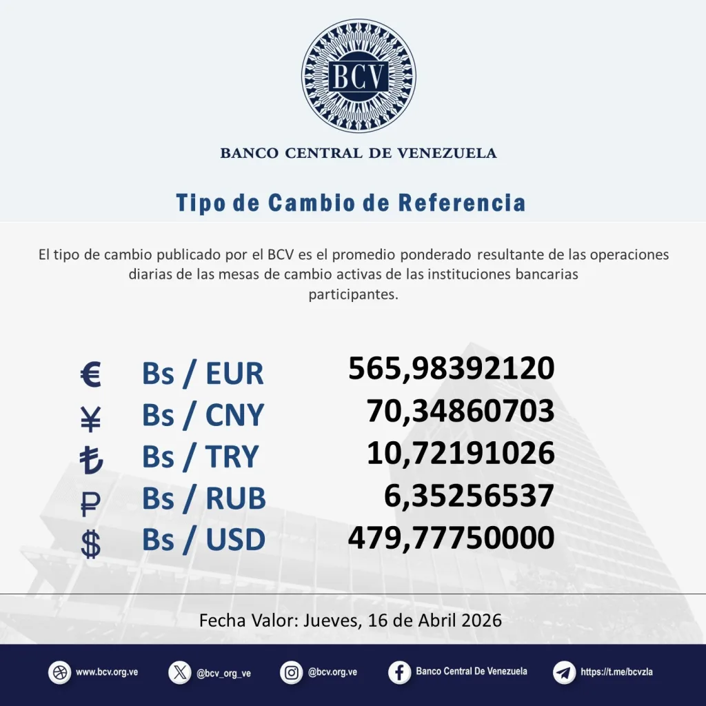El precio del dólar BCV ya superó los 479 bolívares por dólar. El dólar oficial del Banco Central de Venezuela (BCV) se paga este jueves 16 de abril en 479,77 bolívares por dólar. Mientras, el euro, la moneda que actualmente tiene mayor valor, se ubica en 565,98 bolívares.