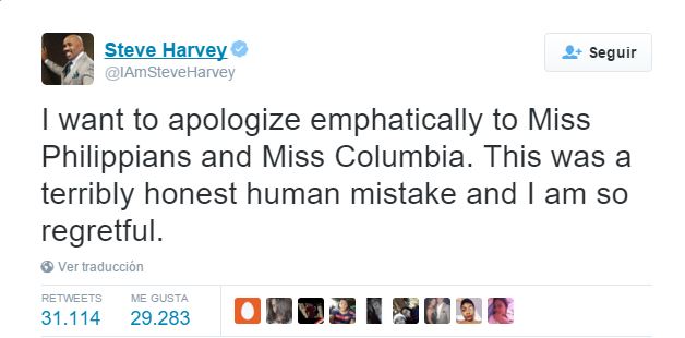 Luego, Harvey se disculpó nuevamente con las concursantes a través de su cuenta en Twitter (con los nombres de ambos países mal escritos, lo que hizo que borrara el tuit).