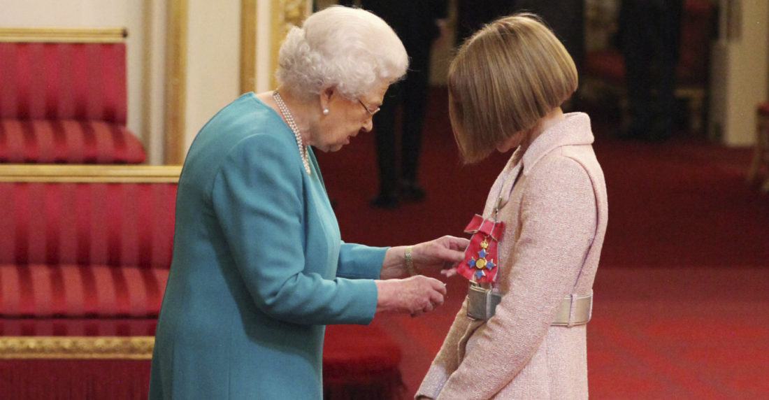 El título de dama que recibió Wintour es equivalente al de caballero. Le fue otorgado por sus servicios a la moda y el periodismo el viernes en una ceremonia en el Palacio de Buckingham.