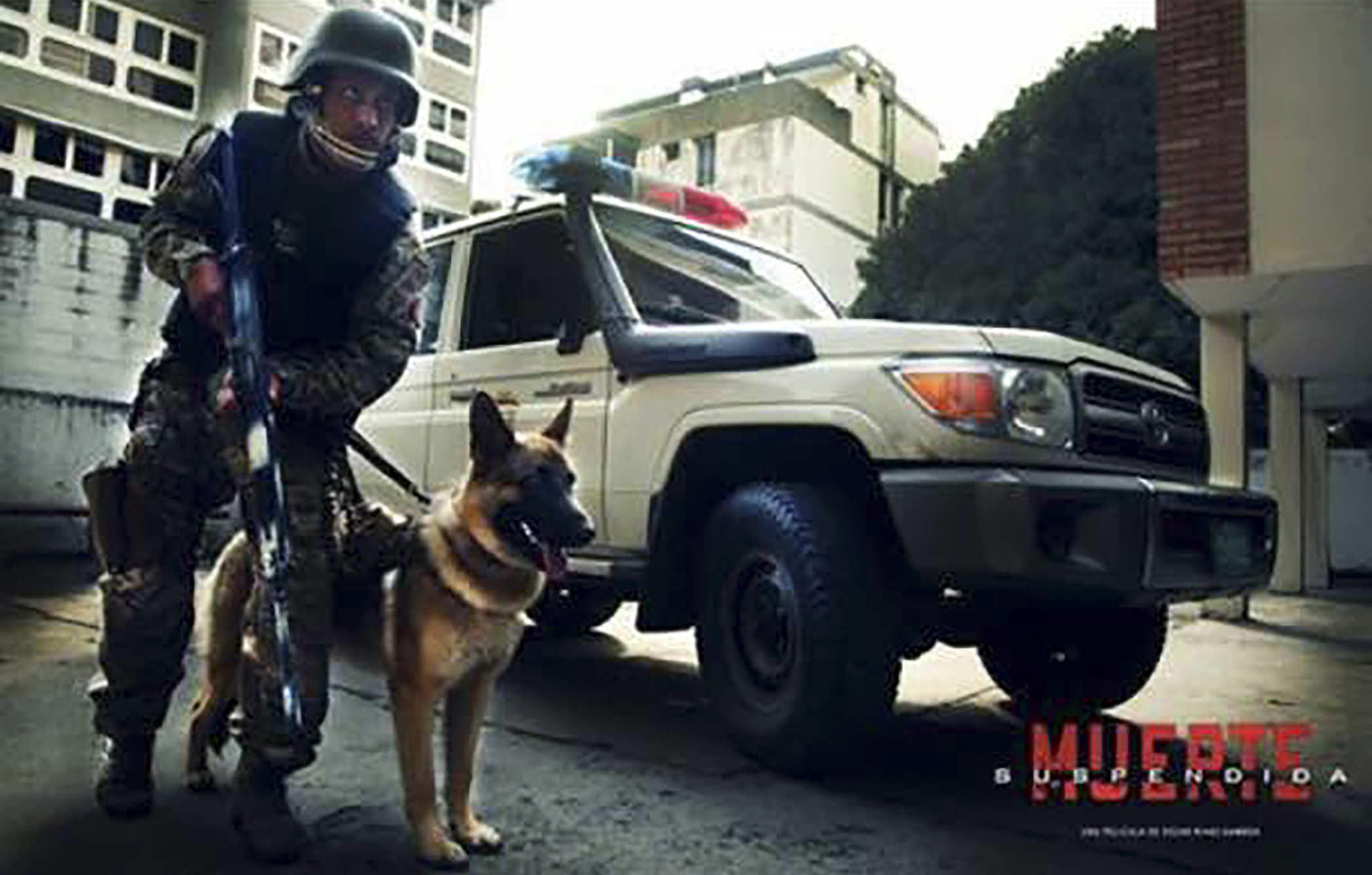 Con efectos especiales de una bala que pega en un casco, computadoras con interfaz holográfica estilo Minority Report e Iron Man y secuencias de entrenamiento del legendario Grupo BAE que incluyen lanzamientos en paracaídas de perros antidrogas en Higuerote, la recién estrenada Muerte Suspendida va por el rescate del espíritu del cine policial de la era petejota estilo Cangrejo (1982), aunque sin desnudos femeninos y despacho regulado de groserías, reservadas para el enemigo claramente identificado: el paramilitarismo importado de Colombia (de inmediato escucharás un “Restrepo”). La película dirigida por el debutante Oscar Rivas Gamboa incluye una Operación de Liberación del Pueblo en un barrio llamado La Acequia.