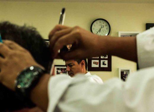 El olor a laca no se respira en las barberías. Se inhala el olor del alcohol en spray y se exhalan bromas en voces gruesas. Sillas de cuero vino tinto albergan hombres vestidos con delantales negros. Todos esperan al barbero. Y a su hojilla.