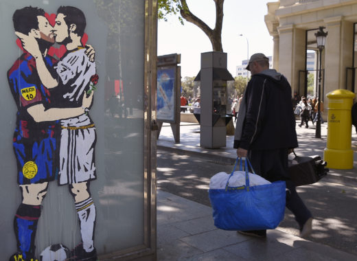 Un grafiti del argentino Lionel Messi de puntillas besando al portugués Cristiano Ronaldo está causando sensación en Barcelona a dos días de que FC Barcelona y Real Madrid se enfrenten en un partido crucial para la Liga española.